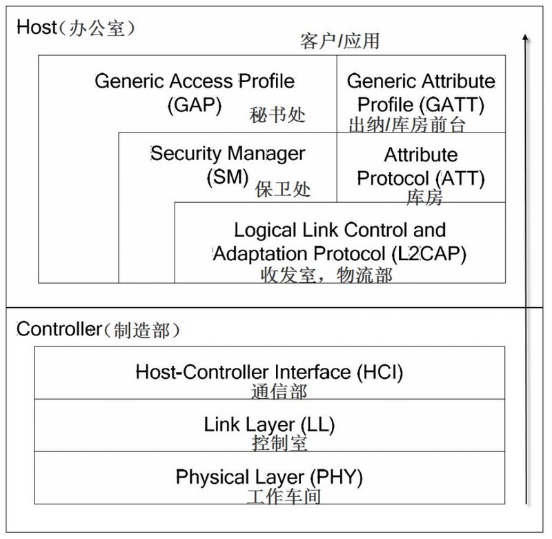 BLE 协议架构总体上分成3块,从下到上分别是:控制器(Controller),主机(Host) 和应用端(Apps);3者可以在同一芯片类实现,也可以分不同芯片内实现,控制器(Controller)是处理射频数据解析,接收和发送,主机(Host)是控制不同设备之间如何进行数据交换;应用端(Apps)实现具体应用。