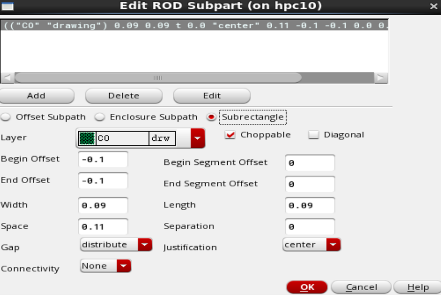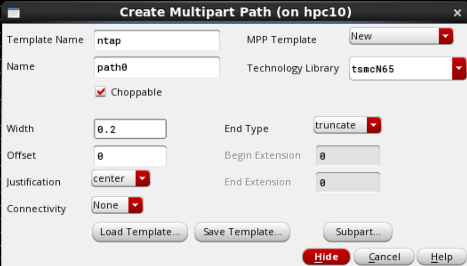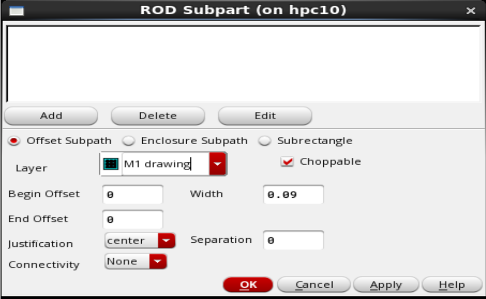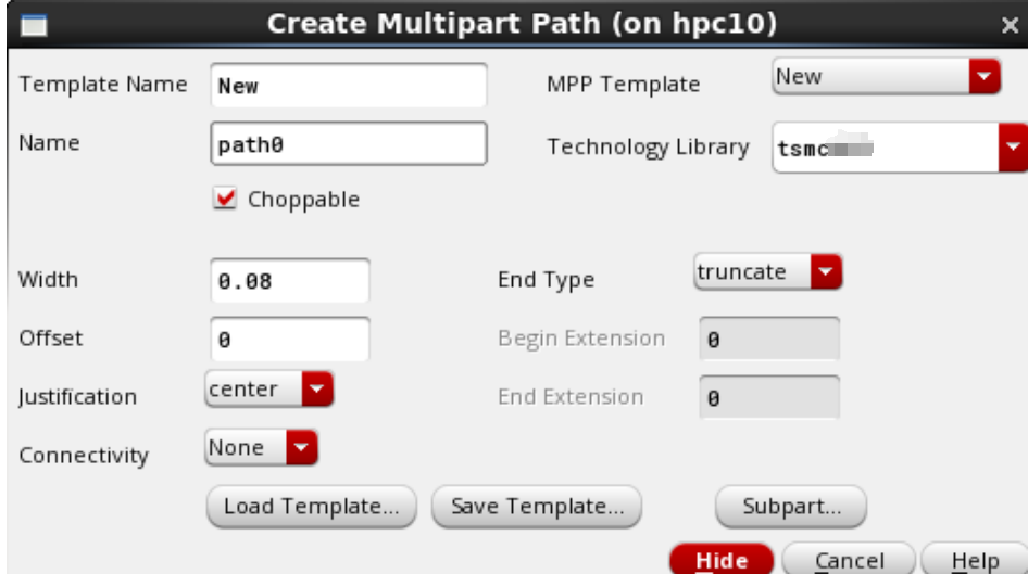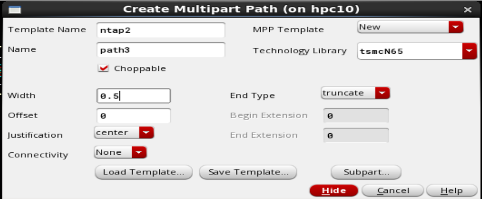 2. 在Create Multiparty Path界面,Template Name填上ntap,Choppable默认是勾选的(勾选上,这个layer就可以切断,),Width根据工艺来填,这填0.2(0.2um);然后点击右下角的Subpart,进入ROD Subpart界面;