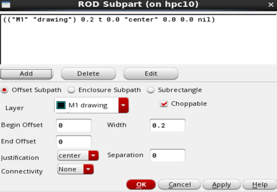 (1) 添加Metal1,选上Offset Subpath,Choppable默认是勾上的,Layer选择M1,在这个ntap中,假设Metal1和OD完全重叠,所以Begin Offset和End Offset都填0,Width和OD一样是0.2,Add后如下图所示;