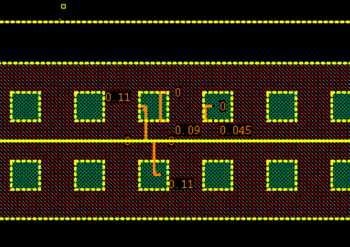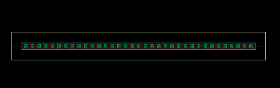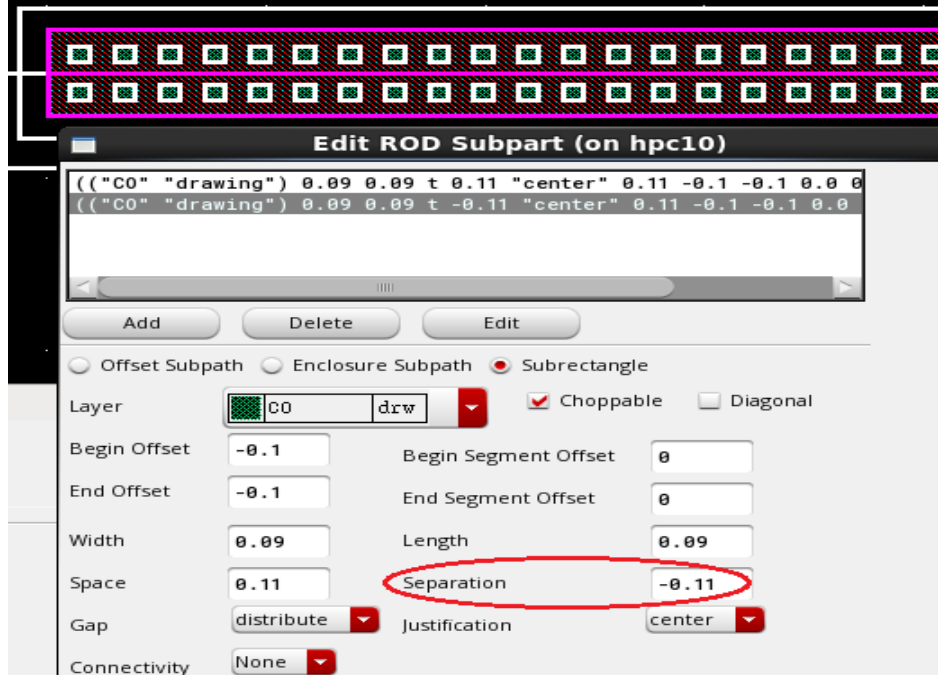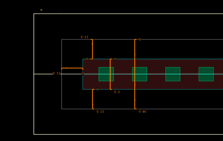 (2) 添加metal1,nplus和NWELL的方法和前面一个Contact的ntap一样,这里就不详细说明;(3) 和一个Contact的ntap不一样的地方在添加Contact,两排Contact要添加两次Contact,而这两次不同的地方在Separation的参数;以下图说明假设两排Contact的space是0.13um;由于基准layer是OD,上排的Contact的中心相对基准OD的中心是正的0.11um,所以Separation是0.11,下排的Contact的中心相对基准OD的中心是负的0.11um,所以Separation是-0.11,最后得到的两排Contact的ntap如下图如所示。