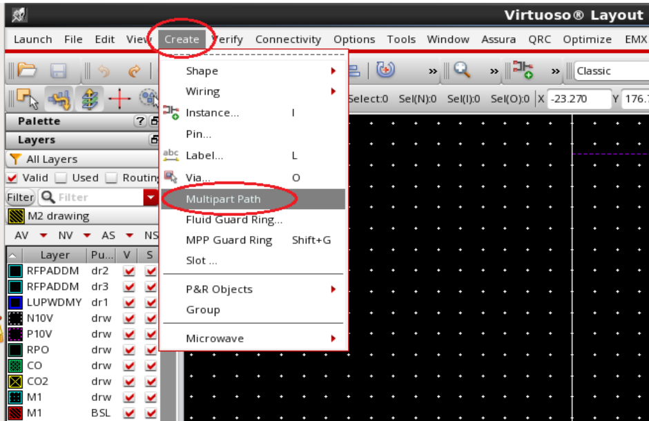 Ntap/Ptap ring在Layout中都要用,在本文,将以N型的ring(ntap)为例,和大家分享创建ring的方法。首先,需要了解ntap包含哪些layer?常见的工艺,ntap包含OD,metal1,Contact,nplus和NWELL。接下来以图说明如何创建ring(以下涉及到的layer及参数请以实际使用的PDK为准)。1. 在Layout界面,先选择一个layer作为参考layer,比如选择OD, 然后Create ==> Multipart Path,再按快捷键F3出现创建ring的界面;