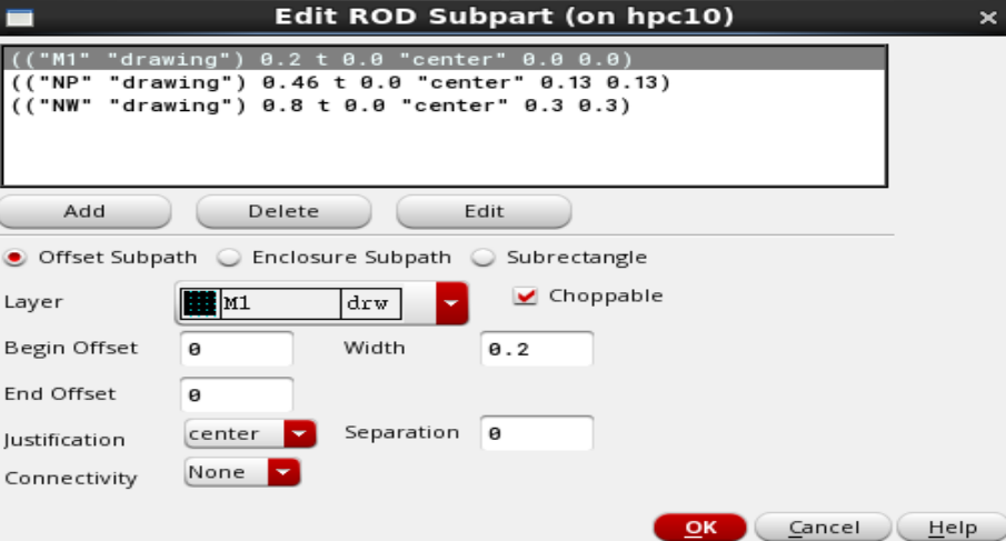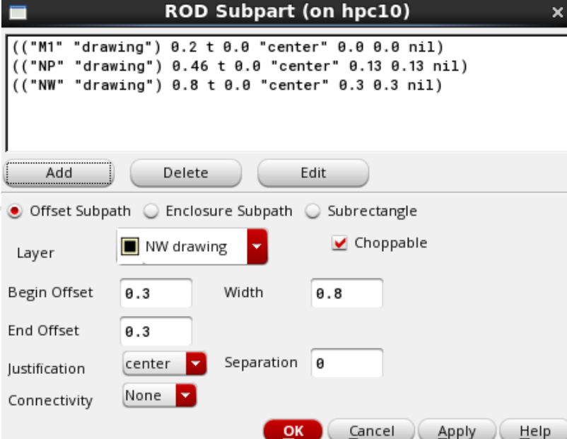 (3) 添加NW,选上Offset Subpath,Choppable默认是勾上的,Layer选择NW,Begin Offset和End Offset都填0.3,Width是0.8,然后Add;