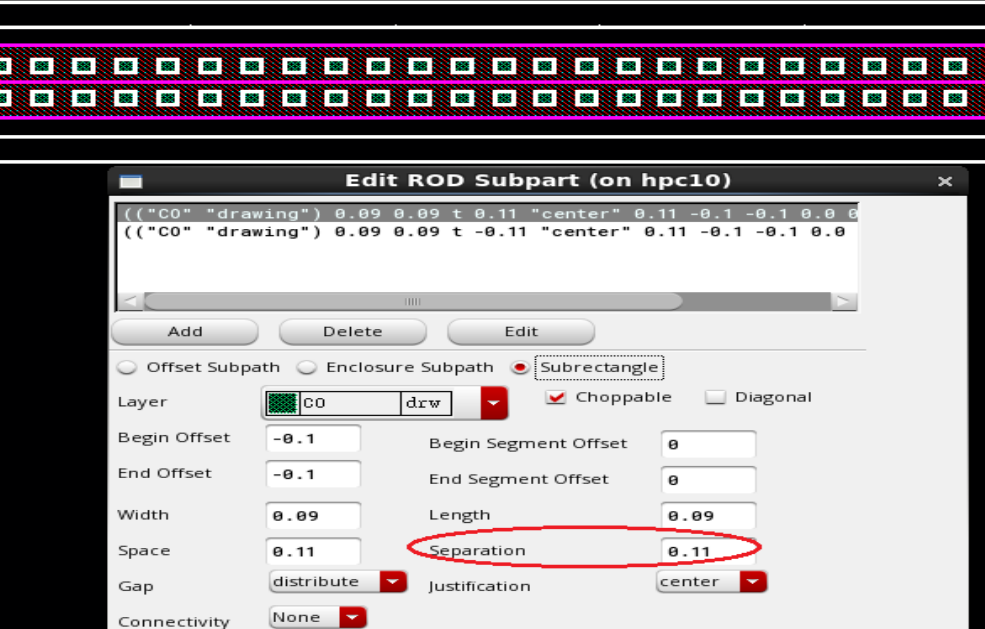 (4) 添加Contact,选Subrectangle,Choppable默认是勾上的,Layer选择CO,Begin Offset和End Offset都填-0.1(意思是Contact相对于OD内缩0.1um),Width,Length,Space根据工艺填,这里参数如下图,然后Add;