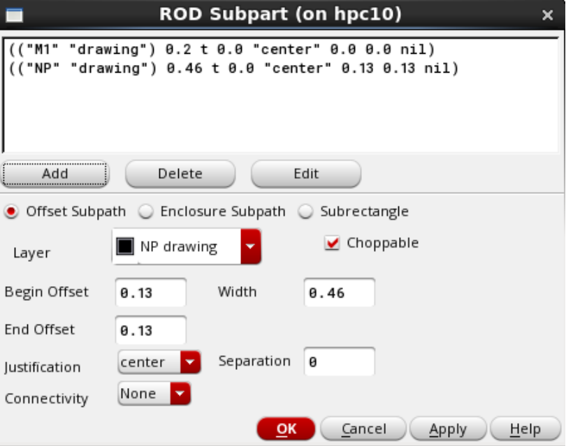 (2) 添加nplus,选上Offset Subpath,Choppable默认是勾上的,Layer选择NP,Begin Offset和End Offset都填0.13,Width是0.46,然后Add ;