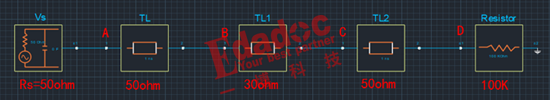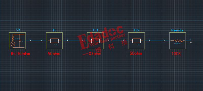 其中激励源Vs的内阻为50ohm,TL,TL2均为50ohm阻抗,延时1ns的均匀传输线,TL1作为变量,模拟在PCB布线时发生阻抗突变的线段,负载Resistor为100K的电阻相当于开路端接。