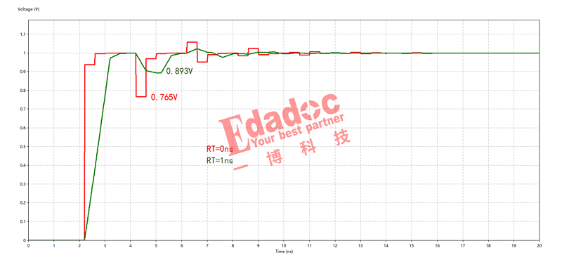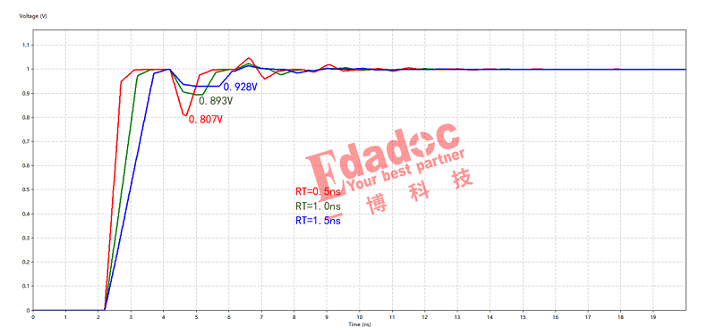 激励源Vs设置幅度为1V,上升时间RT分别设置为0.5ns,1ns,1.5ns的脉冲;
