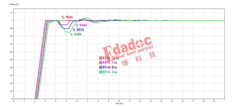 TL1设置阻抗为30ohm,延时分别为0.01ns,0.1ns,0.2n,0.3ns;