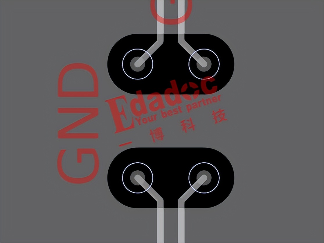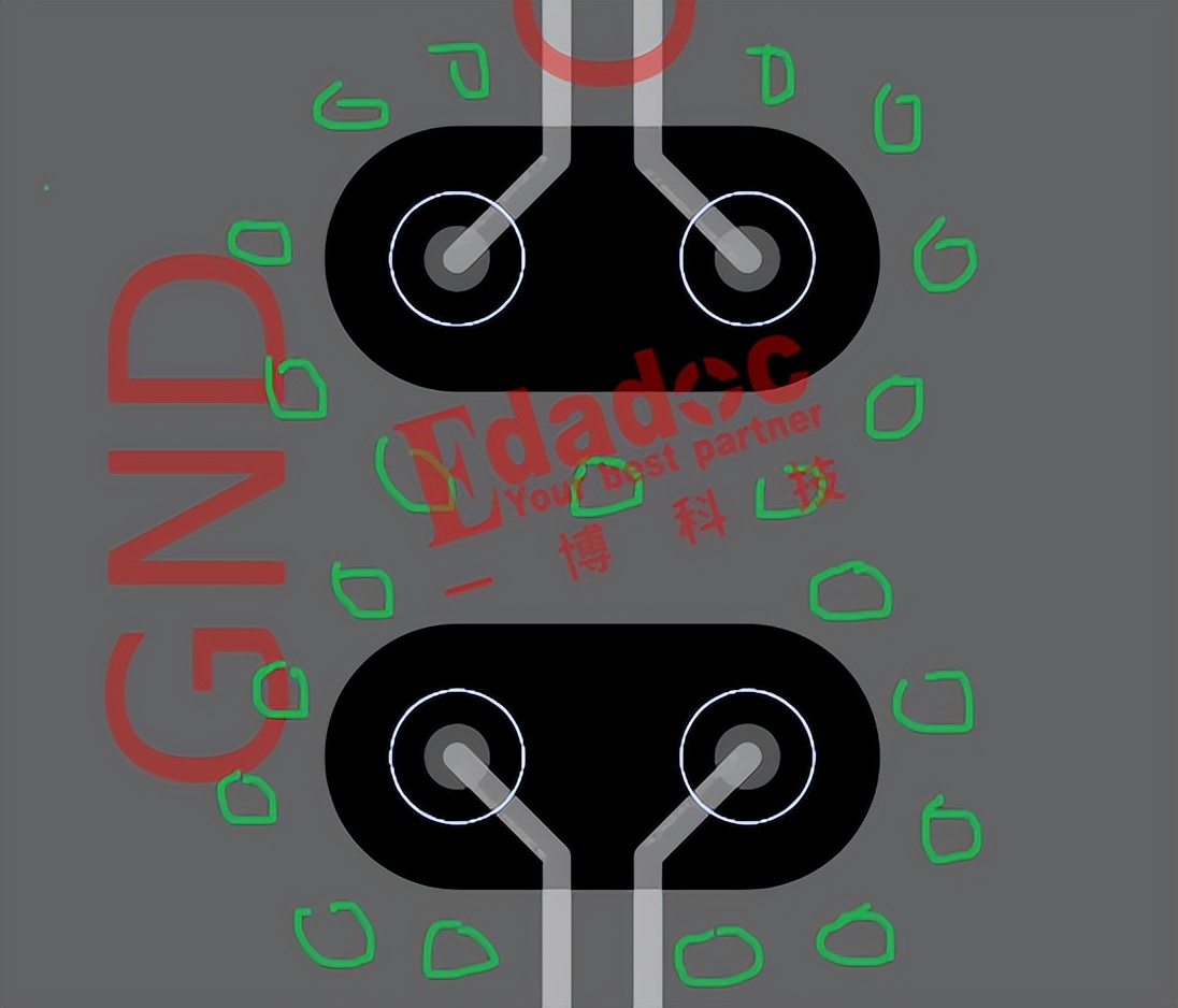 别急嘛,虽然也还是过孔,但是角度是不同的嘛。今天我们来讲讲两对高速过孔之间的串扰怎么通过合理的规划隔离地过孔放的位置来减少。说白了,我们这篇文章想研究的是两对高速信号的过孔位置定了之后,到底地过孔要放在哪个位置能最大程度的减小串扰哈!例如下面这个设计图,两对信号过孔位置固定后,要怎么加地过孔的效果最好呢?