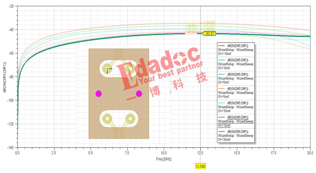 主要是上面第一个case之后得到的灵感,也就是隔离地过孔越靠近,串扰越好。然而,仿真扫描后的结果又会让大家再跌一次眼镜。对从近到远的地过孔位置进行扫描,发现靠近的是最差的(红色曲线),远离的这种反而是串扰最好的设计。