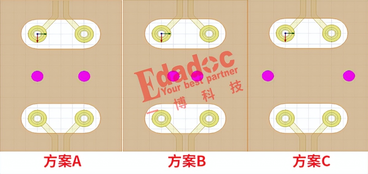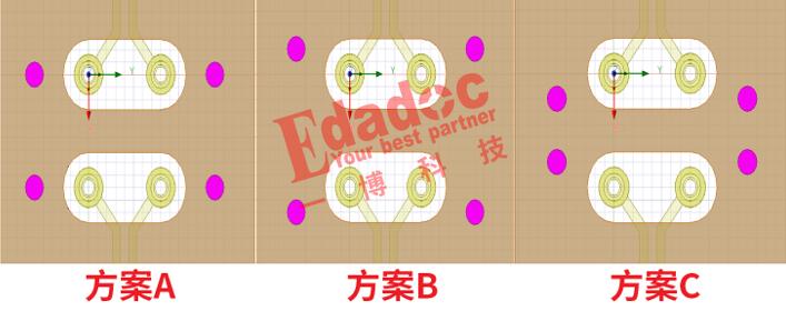 相信大部分会选择方案A的方式吧,把地过孔打在信号过孔水平方向的左右两边。对比方案A,方案B就是在竖直分别往上下远离点来打,方案C就是在竖直方向分别往上下靠近点来打。各位设计工程师你们觉得上面三种方案的串扰到底哪种好呢?