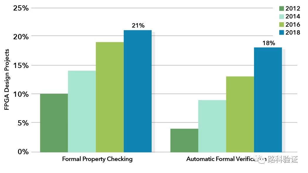 图4展示了,形式验证检查,例如模型检查,和自动化形式验证应用程序被采用的趋势。FPGA项目的形式验证属性检查的采用率正在以惊人的21%CAGR增长,采用了自动化形式验证应用程序的复合年增长率为29%。我们都知道,形式验证属性检查需要专业的技能和知识。然而,最近出现的自动形式验证应用程序提供了严密集中的解决方案,并且不需要专门的技术。一般而言,形式验证的解决方案(即形式验证属性检查与自动化形式验证应用程序相结合)是功能验证中增长最快的部分之一。