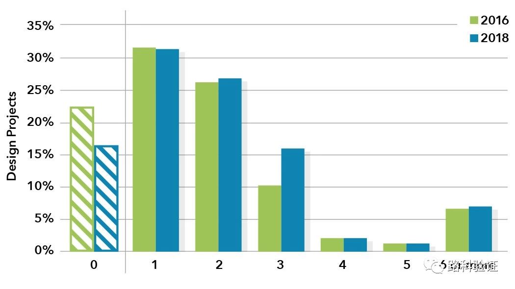 IC / ASIC项目经常使用“量产前所需自旋次数”这一指标作为评估项目验证有效性的基准。一般来说,大约30%的IC / ASIC项目能够实现首次硅片成功,而大多数的设计都是在第二次硅片自旋成功后才能实现产品化。不幸的是,FPGA项目没有等效的指标。作为IC / ASIC自旋的替代方案,我们的研究是向FPGA参与者询问“有多少重大的漏洞被投入生产?”。如图1所示,在2018年,只有16%的FPGA项目没有漏洞被投入到生产中,这在首次硅片成功方面比IC / ASIC差,而对于某些细分市场,现场维修的成本可能很高,这是非常糟糕的。