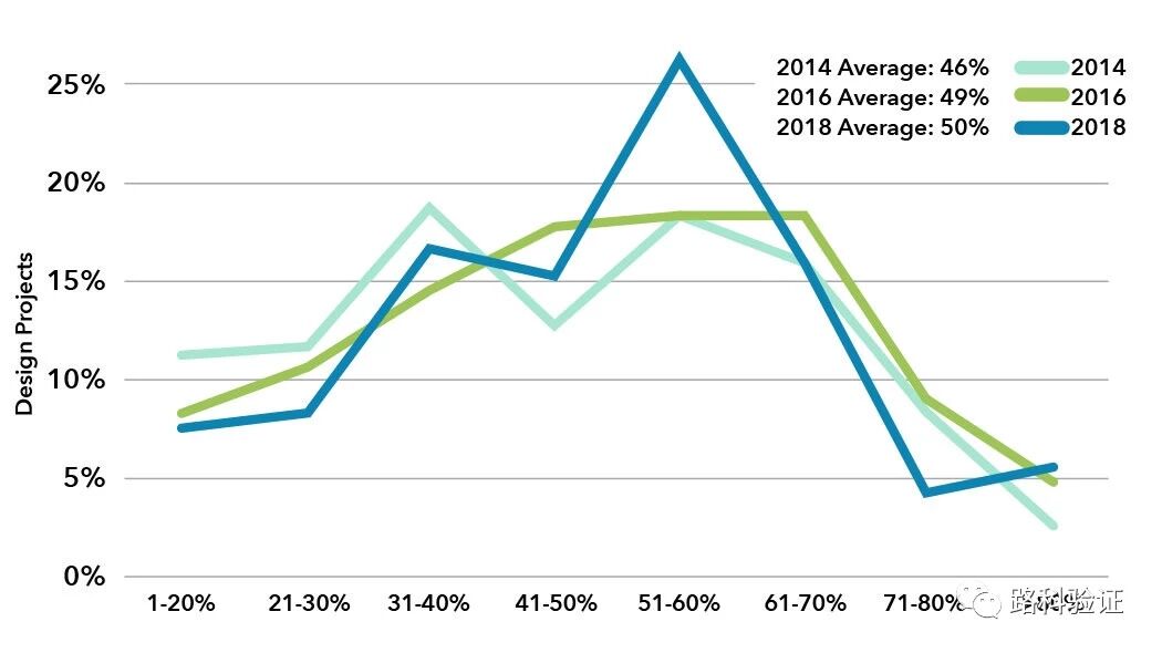 总体而言,发现2014年至2018年期间用于验证的FPGA项目时间平均百分比有所增加,这表明设计和验证的复杂性在不断增加。