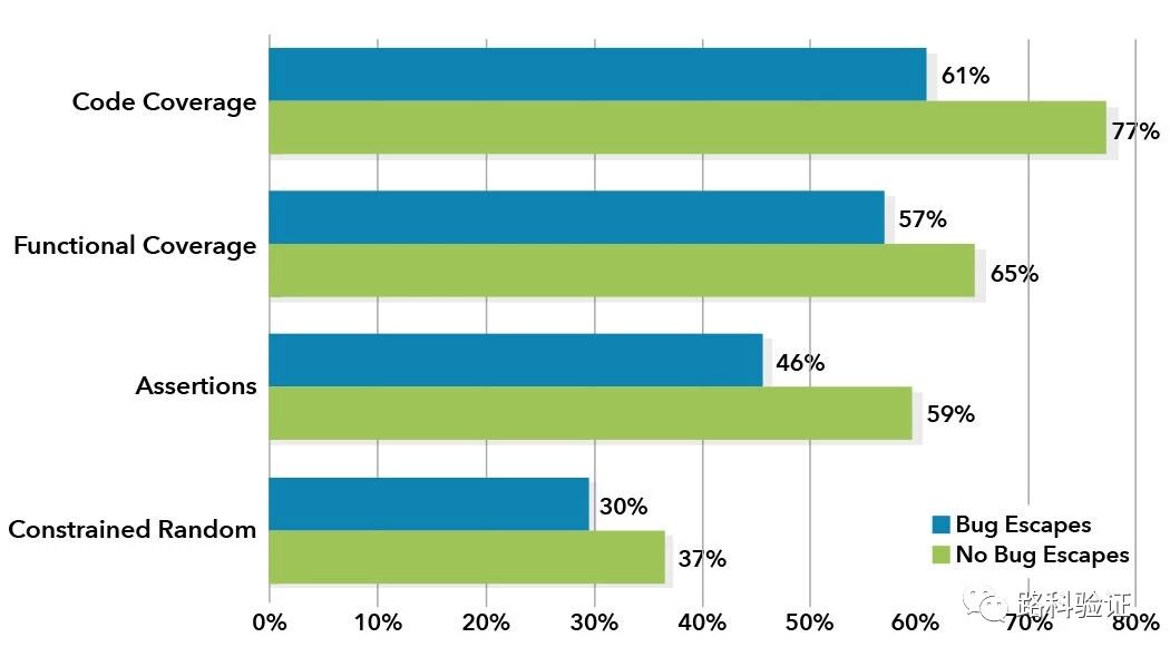 也许今年研究中最令人不安的要数重大漏洞逃逸到生产的FPGA项目的数量了,同时也发现了减少功能缺陷与重大bug逃逸到生产之间的有趣关联,如图1所示,以及FPGA项目功能验证过程的日益成熟。数据表明,在功能验证过程中更成熟的项目可能会减少错误逃逸。为了测试这一说法,将研究参与者分为两组:没有漏洞逃逸的FPGA项目和遇到漏洞逃逸的FPGA项目。然后检查了各种验证技术的采用百分比,结果如图6所示。这些发现具有统计意义,因为没有漏洞逃逸的组往往更多地采用了各种验证技术,这表明他们的验证过程更加成熟。但是,无法从研究中衡量的是项目在采用这戏嗯验证技术方面的有效性。例如,遇到漏洞逃脱的项目可能声称他们已采用功能覆盖,但由于缺乏经验,其功能覆盖率模型的保真度可能较差。根据研究数据,无法评估任何特定验证技术的成功或有效采用。