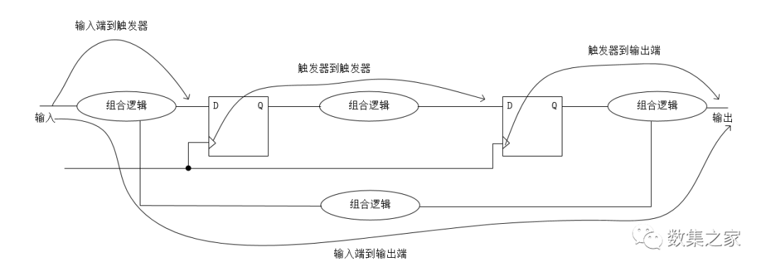 时序路径根据始发点到终止点的不同可分为4中类型的时序路径:触发器到触发器、触发器到输出端、输入端到触发器和输入端和输出端。如下图所示
