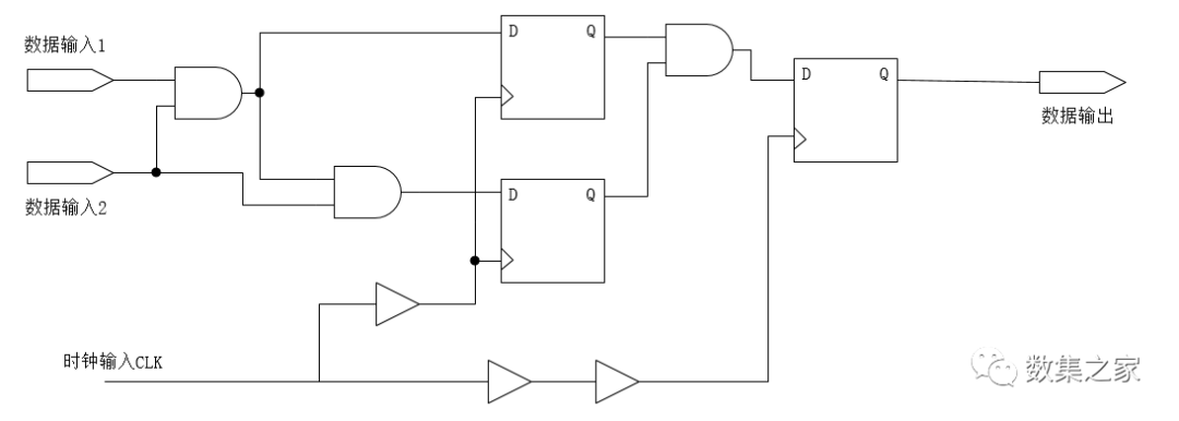 时序分析中定义的始发点可以分为两种:组合逻辑单元的数据输入端口和时序单元的时钟输入端口。如下图中的数据输入1、数据输入2、时钟输入CLK和3个D触发器的时钟端口。