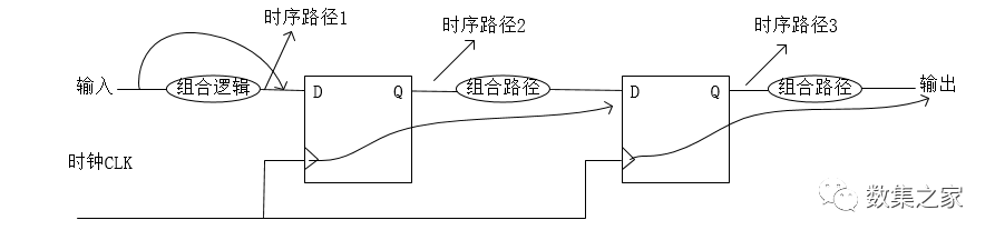 时序路径(timing path)是指设计中数据信号传播过程中所经过的逻辑路径。每一条时序路径都存在与之对应的一个始发点和一个终止点。如下图所示。
