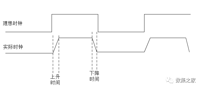 理想情况下,时钟信号在不同电平之间进行切换是不需要时间的,但是实际时钟信号在不同电平之间切换时,由于供电电压、工艺变化、扇出负载大小等因素,是需要转换时间的。