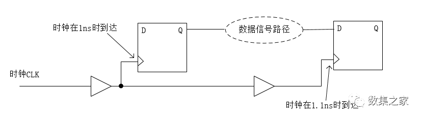 非理想情况下,由于时钟线长度及时钟树叶节点负载不同等因素,导致时钟信号到达同一时序路径下的相邻两个时序单元时钟端口的时间并不相同,这种时钟信号之间的偏移就是相同时钟信号之间的时钟偏斜,如下图所示。