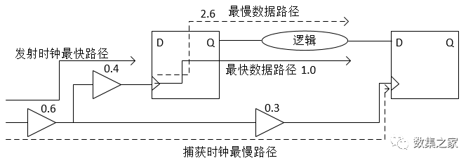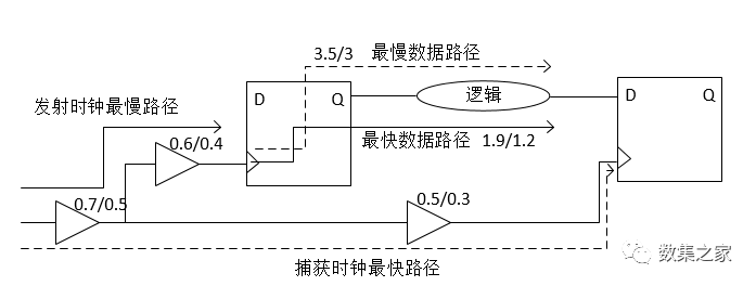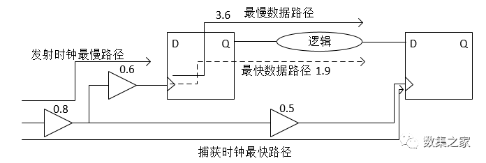 数据到达延时值=发射时钟最快路径延时值+最快数据路径延时值=0.9+1=1.9