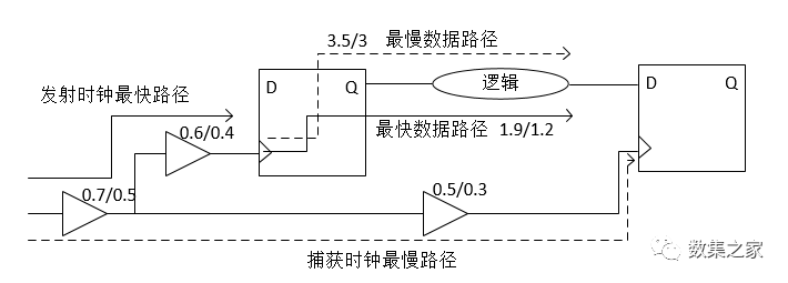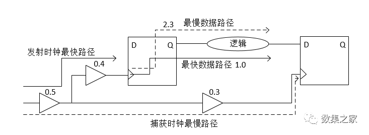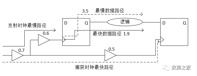 捕获时钟最慢路径延时值(MAX)=0.7+0.5=1.2