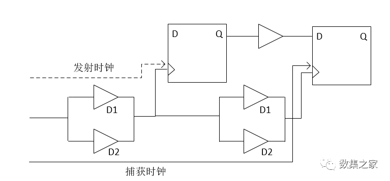 以最典型的时序路径延类型触发器到触发器为例,进行单一分析模式建立时间计算,如下图所示。