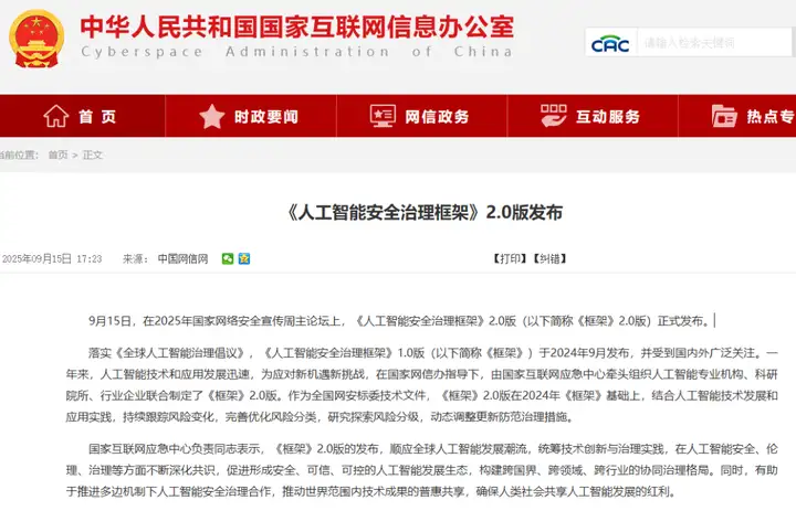 在2025年国家网络安全宣传周主论坛上,《人工智能安全治理框架》2.0版(以下简称《框架》2.0版)正式发布。落实《全球人工智能治理倡议》,《人工智能安全治理框架》1.0版(以下简称《框架》)于2024年9月发布,并受到国内外广泛关注。一年来,人工智能技术和应用发展迅速,为应对新机遇新挑战,在国家网信办指导下,由国家互联网应急中心牵头组织人工智能专业机构、科研院所、行业企业联合制定了《框架》2.0版。作为全国网安标委技术文件,《框架》2.0版在2024年《框架》基础上,结合人工智能技术发展和应用实践,持续跟踪风险变化,完善优化风险分类,研究探索风险分级,动态调整更新防范治理措施。(来源:网信中国)