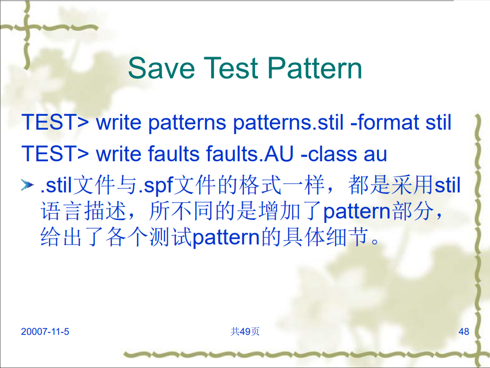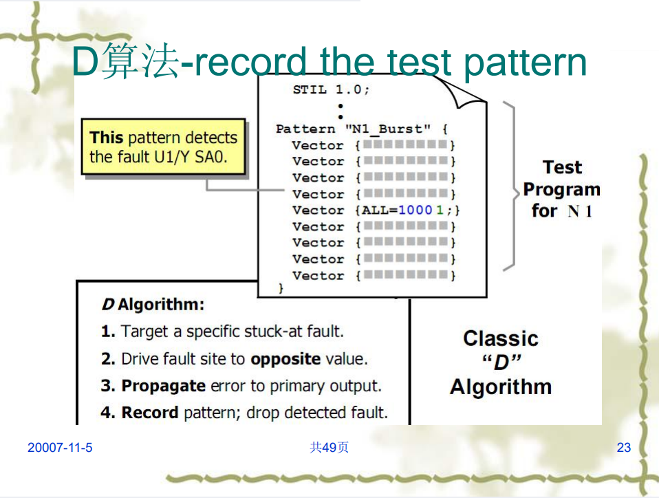ATPG (Automatic Test Pattern Generation)自动测试向量生成是在半导体电器测试中使用的测试图形向量由程序自动生成的过程。测试向量按顺序地加载到器件的输入脚上,输出的信号被收集并与预算好的测试向量相比较从而判断测试的结果。