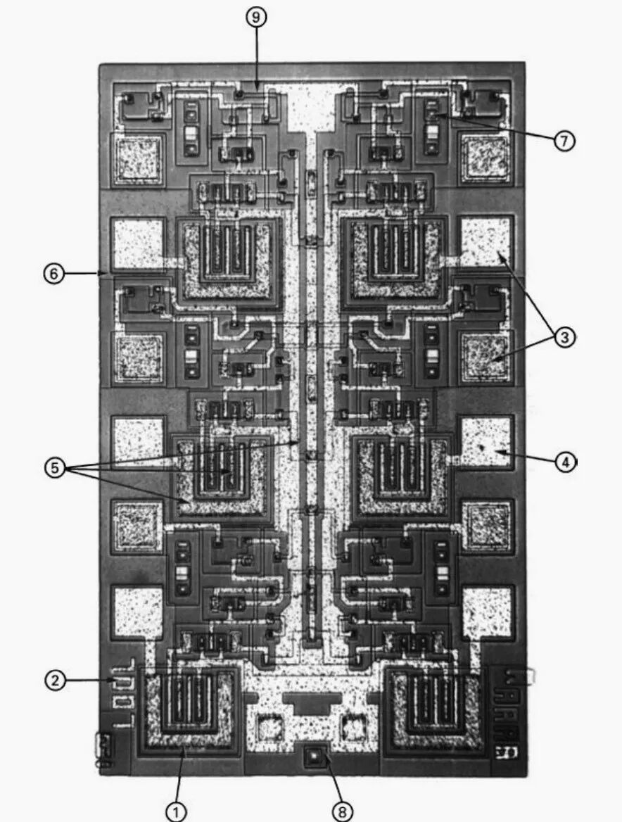 以一个中规模(MSI)/双极型集成电路(IC)的显微照片为例。(之所以选择这个集成等级,是为了照片上能显示出电路的具体图形。对于更高集成度的电路,它的元件非常小,以至于在整个芯片的显微照片上无法辨认。)下图中芯片的特性是: