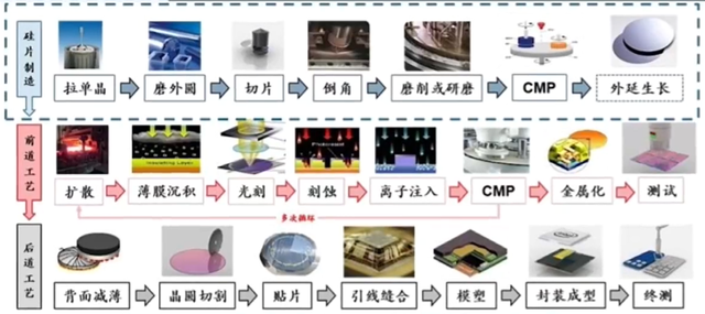 晶圆制造可分为前端工艺(Front end)和后端工艺(Back end)。前端工艺主要是制备晶体管,后端工艺为晶体管制备之后的多层布线工序。总体而言,前端是需要多次重复相同的工序进行产品生产的方式,因此称为“循环型工艺”。前端制程主要包括:清洗、氧化、光刻、刻蚀、离子注入和热处理、成膜、平坦化(CMP,Chemical Mechanical Polishing,化学机械抛光)、中测,多次循环并把前段制程集成化。
