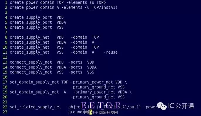 在power intent文件中,我们根据要求创建了两个电源域,并且为电源域指定了供电端口和供电线,并将供电端口和供电线进行连接构成供电网络,而且我们还为两个电源域显式的指定了主供电线网络,最后根据要求,VDD掉电后instA1的out1也将被关掉,这样我们需要为instA1的out1端口指定相对的供电线VDD。