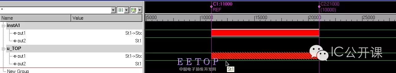 由仿真图可以看到instA1的out1有一段时间被corrupt掉了,而这段时间正是VDD掉电时,当VDD重新上电instA1的out1又恢复正常了;instA1的out2输出不受VDD掉电的影响。