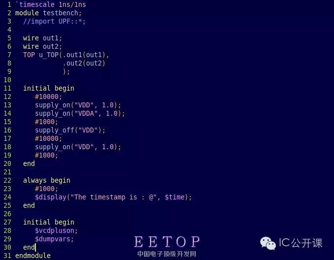 按照通常的testbench的写法,同时要模拟电源行为,我们使用了supply_on和supply_off函数,这两个函数是upf标准中定义的两个标准库函数,其中supply_on函数接受两个参数:参数一为字符串常量,所取值应该为power intent文件中定义的供电端口名,参数二为电压值。supply_off函数只有一个字符串常量参数。