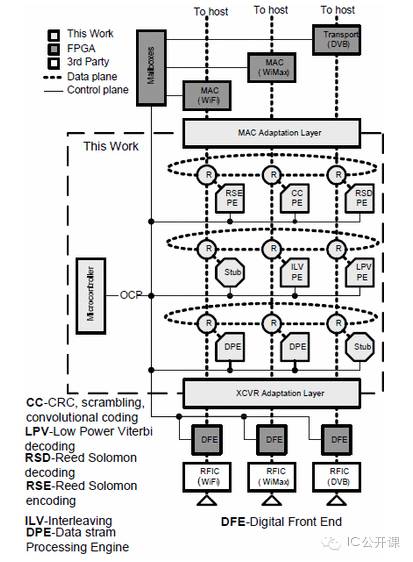 看到这张图的时候,哥突然有种醍醐灌顶外加泪流满面的感觉。这么多年苦苦寻求的用于通信的可重构处理器,其实就是这个样子的……同时兼容了wifi,wimax和DVB的基带处理器~~~虽然我觉得这个设计也不是特别好。