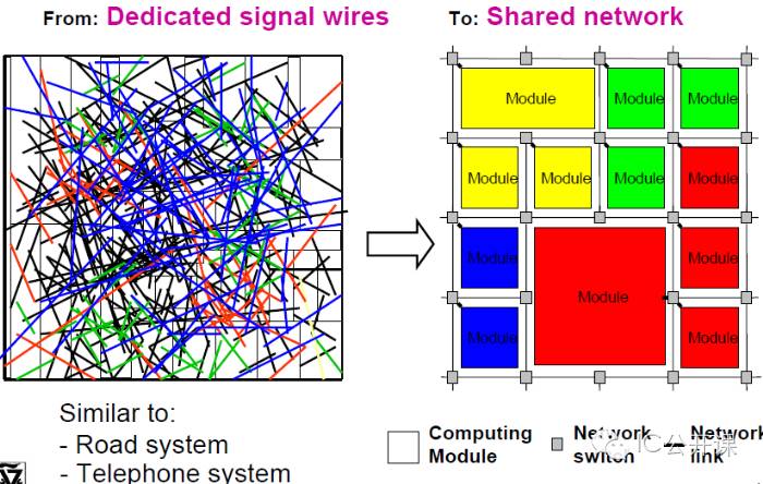 各位看出来了吧,这套NoC的用法就和上面的CMP的用法有着本质的区别。可以说是原来ASIC/SoC设计的一个变种。那么如果说这玩意还有点抽象的话呢,那么晚我再上一个图,